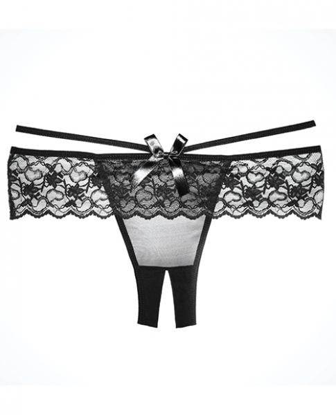 This flirty black panty features a sheer, scalloped lace waist band with strappy detailing, a satin bow accent, a sheer mesh front panel, an open crotch, and a cheeky cut back. Color Black. One size fits most. Waist 26 inches to 30 inches. Low waist 28.5 inches to 32.5 inches. Hips 36 inches to 40 inches.