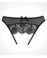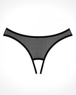 Fulfill his darkest desires in this sexy panty featuring a low cut waist, a sheer mesh front, a bikini style with an eyelash lace back panel, a striking satin bow accent, and an open rear with booty shaping straps. Leave nothing to the imagination. Color Black. One size fits most. Waist 26 inches to 30 inches. Low waist 28.5 inches to 32.5 inches. Hips 36 inches to 40 inches.