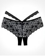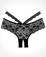 Amp up the sex appeal in this flirty panty featuring an all over sheer scalloped lace, a low cut waist, a strappy high waist detail, an open crotch panel, and a cheeky cut back. Color Black. One size fits most. Waist 26 inches to 30 inches. Low waist 28.5 inches to 32.5 inches. Hips 36 inches to 40 inches.