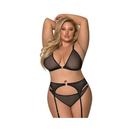 This all-in-one two-piece outfit has a bra and panty appearance, but is actually attached with a neck choker and vertical belly strap for a uniquely sexy look! Stretchy black mesh bra cups and panties attach at the front to a satin strap with lace adornments at the belly and neck, creating a kinky appeal, enhanced further by the satin waistband and lace feature at the back of the bra. Black mesh 2-Piece Teddy with lace adornments Bra and panties attached at front Kinky look with choker and waist straps Lace adornments at neck, belly and back of bra Adjustable straps on bra Sexy cheek-peeking thong panties Made from body-hugging stretchy mesh No underwire Imported polyester/elastane One size fits most