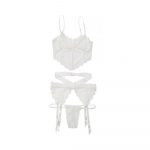 Longline soft cup bra. Front boning. Strappy garter belt details. Adjustable G-string. White OS. Scallop Stretch Lace. Size OS: Bust 34-40″, Waist 26-32″, Hip 36-42″, Cup B-E, Dress 2-12