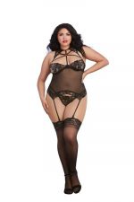 Bustier and G-String Black Queen Size from Dreamgirl lingerie line. Strappy Bustier ties like a halter and at the back for an adjustable fit. Matching g-string panty included. Ladies plus sizes, one size queen. Dress sizes 16 to 20. Weight 165 pounds to 275 pounds. Fabric content 90% Nylon, 10% Spandex. Care hand wash cold water. No bleach. Line dry. Please note stockings not included.