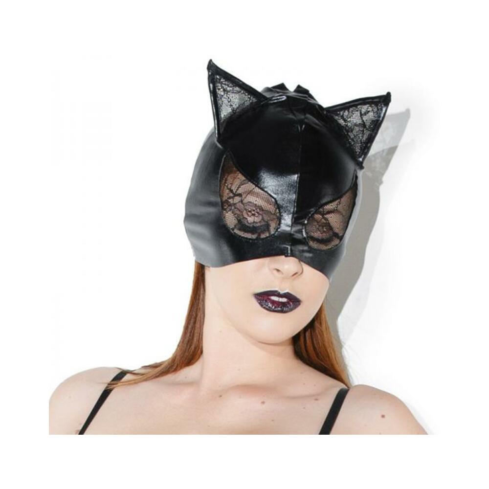 1-piece wetlook cat mask with lace eyes and ears. Black O/S Gloves, Romper not included