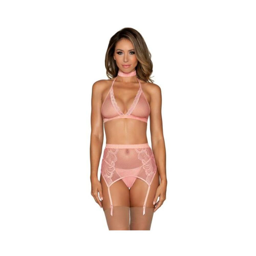 Fishnet and lace four-piece set with stretch-velvet trim accents. Halter bralette with adjustable back closures Garter belt with attached/adjustable garters Adjustable waistband Matching fishnet G-string -Velvet choker necklace included Shown with Style 0007X thigh highs; sold separately