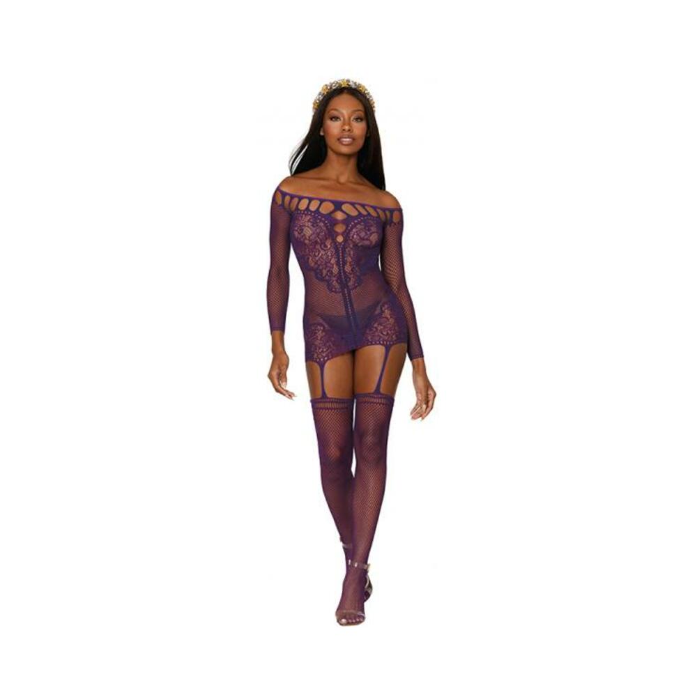 Dreamgirl Fishnet Lace Garter Dress With Attached Stockings Aubergine O/s