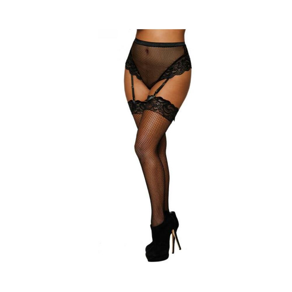 Dreamgirl High-waist Fishnet And Lace Gartered Thong With Keyhole Ribbon-tie Back Black L