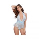 Stretch, scalloped, galloon lace teddy with plunging halter neckline, fluttery chiffon ruffles at the hip, and peek-a-boo back. Open crotch Tie-neck closure Satin back-tie bow at the waist Size OS: Size 2-14, Cup B/C, Weight 90-160 lbs., Bust 32-38″, Waist 24-31″, Hip 34-40″