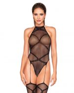 Fishnet Garter Teddy Bodystocking Black O/S from Dreamgirl Lingerie. Tie Back Fishnet Garter Teddy Bodystocking with Halter Neckline. Fishnet garter teddy bodystocking featuring: knitted criss cross design. Halter neckline with tie back closure. Attached garters and matching thigh high stockings. The last image is a size chart from Dreamgirl Lingerie.