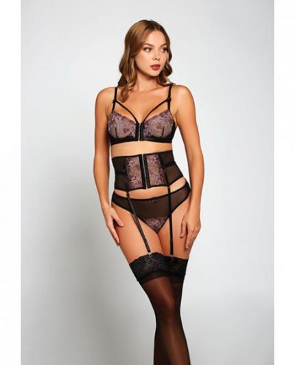 There’s no doubt that you’ll grow your babe’s affection in this sexy plus size bra set featuring sheer lace underwire cups with a hook and eye front closure, a strappy chest detail, adjustable spaghetti straps, a matching waist cincher with piping detail, removable adjustable garter straps, and matching g-string panty. (Thigh highs not included.) FABRIC: 90% Polyester, 10% Spandex. 2X. Size: 18-20. Bust: 44in.-47in. Waist: 37.5in.-40in. Hip: 46in.-49in.