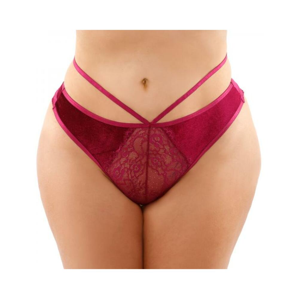Caged Velvet Thong Panty with Keyhole Cut-Out Back Brand: Bottoms Up Color: MagentaMaterials: 80% Nylon, 20% Spandex Washing Instructions: Hand wash separately in cold water. Do not bleach. Flat dry.