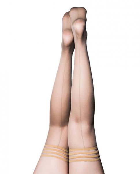 You will Be the Toast of the Town in Champagne Nude Back Seam Thigh high Stockings. No slip grip. Size B. Height 5 ft 5 inches to 6 ft 0 inch. Weight 125 pounds to 170 pounds. Thigh circumference up to 25 inches.