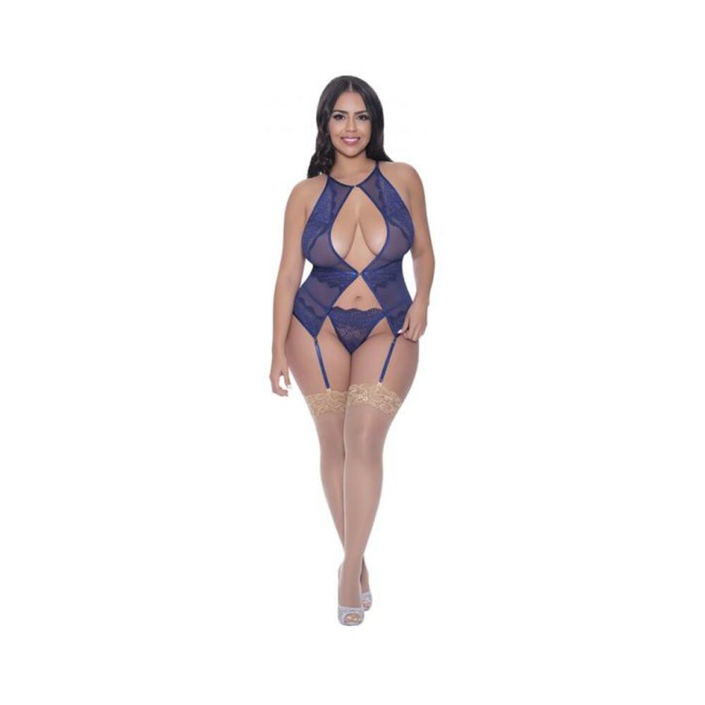 From the Exposed by Magic Silk collection, this style includes: a halter style basque featuring elastic adjustable shoulder straps with gold tone sliders, silk lace-up ribbon in the back, gold tone swan hook closure in the lower front, removable adjustable garters with gold tone sliders, and a matching lace g-string.Ribbons and lace come together for these sweet and flirty styles in delicious blueberry.MaterialsLace: 90% Nylon, 10% SpandexMesh: 84% Polyester, 16% Spandex