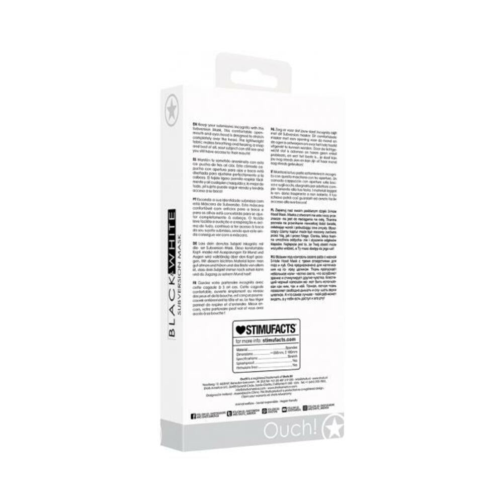 Keep your submissive incognito with this Subversion Mask. This comfortable open-mouth-and-eyes hood is designed to stretch completely over the head. The lightweight fabric makes breathing and hearing a snap and best of all, your subject can still see and you still have access to their mouth! Dimensions package 6.69″ x 3.54″ x 0.98″ Weight package 2.29 oz Product dimensions 15.55″ x 7.09″ x 0.08″ Product weight 1.38 oz Materials Spandex