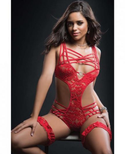 Plunging Halter Teddy with Stockings. From G World. One Size, Bust: 30in.-36in. A-C cup. Weight: 110lb-165lb. Waist 24in.-29in. Hip: 34in.-39in. Size: 0-10.
