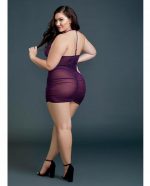 Ruched Sheer Front Zipper Chemise with G-String Panty from Dreamgirl International Red Diamond lingerie line. Color Plum Purple. Ladies plus sizes, one size queen. Sizes 16 to 20. Cups D/DD. Bust 40 inches to 54 inches. Waist 36 inches to 44 inches. Hips 42 inches to 56 inches. Weight 165 pounds to 275 pounds.