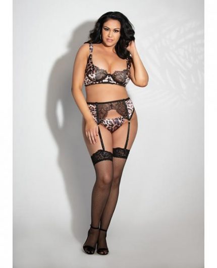 Bring untamed sensuality to the bedroom with this sexy plus size bra set featuring sheer lace and leopard satin underwire cups, adjustable straps, gold hardware, a picot trim, a hook and eye back closure, a matching garter belt with adjustable garter straps, and a matching thong panty. (Stockings not included.) FABRIC: 97% Polyester, 3% Elastane. Large. Size: 10-14. Cup: C/D. Bust: 36in.-38in. Waist: 28in.-30in. Hip: 38in.-40in.
