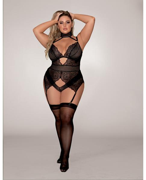 Scalloped Stretch Lace, Snap Crotch Gartered Teddy Black 2x