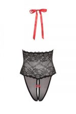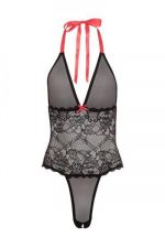 Mesh meets black lace in this plunging V teddy that seamlessly blends a delicate lace bustier with a feather light mesh halter and panties. Exquisitely body hugging for a boudoir look, vibrant red accents draw the eye between the cups and up to the neck where the key to its undoing likes nestled under the hair. Teddy with plunging V neckline. Mesh top and bottom with lace bodice. One size fits most. Body hugging stretchy lace and mesh. Halter style adjustable tie at neck. Vibrant red detail. No underwire. Hand wash. Imported. Fabric content Nylon, Polyester.