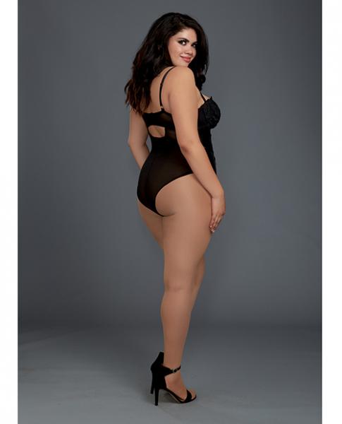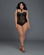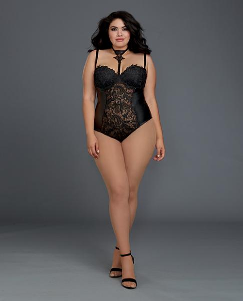 Venice Lace and Stretch Faux Leather Teddy with Snap Crotch from Dreamgirl international lingerie line. Ladies plus size, 1X. Cups D/DD. Bust 40 inches to 44 inches. Waist 36 inches to 38 inches. Hips 42 inches to 44 inches.