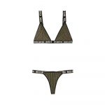 Metallic Rib Knit Bralette with Adjustable Straps and Thong Panty Set. 68% Polyamide 25% Gold Silk 7% Spandex. Hand wash separately in cold water. Do not bleach. Flat dry. COLOR: BLACK/GOLD@np2020-48