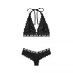 Lace Halter Bralette with “Not Your Bitch” Elastic Strap and Matching Cheeky Panty. 90% Polyamide 10% Spandex. Hand wash separately in cold water. Do not bleach. Flat dry. COLOR: BLACK@np2020-48