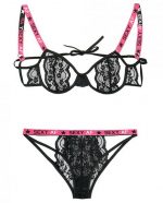 Stretch Lace Cutout Bra with Sexy AF Elastic Straps and Matching Caged Panty. Thick adjustable straps. Ties in back for a custom fit. Matching Caged Panty. Color Black, Pink. Fabric content 90% Polyamide, 10% Spandex. Washing instructions: hand wash separately in cold water. Do not bleach. Flat dry. Ladies size medium to large, M/L. Sizes 8 to 12. Bust 36 inches to 38 inches. Hips 38 inches to 41 inches.